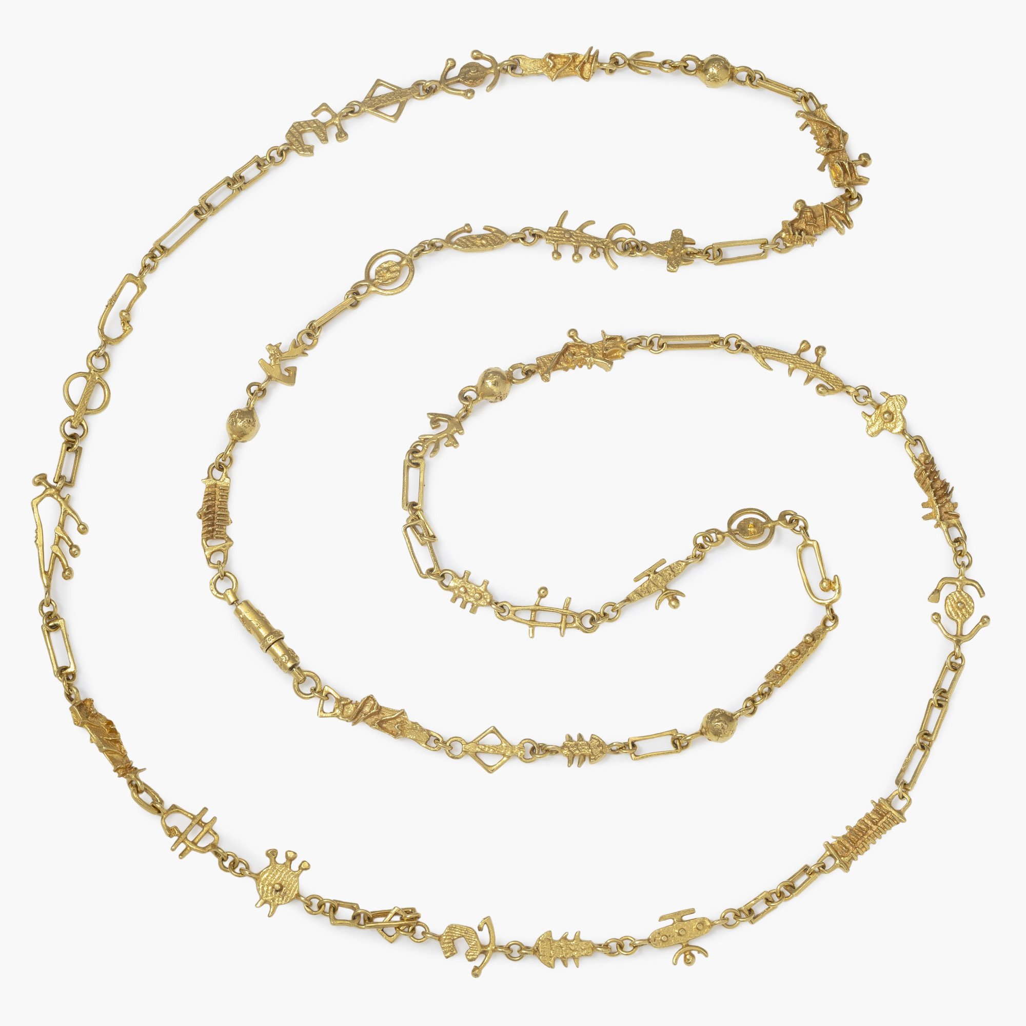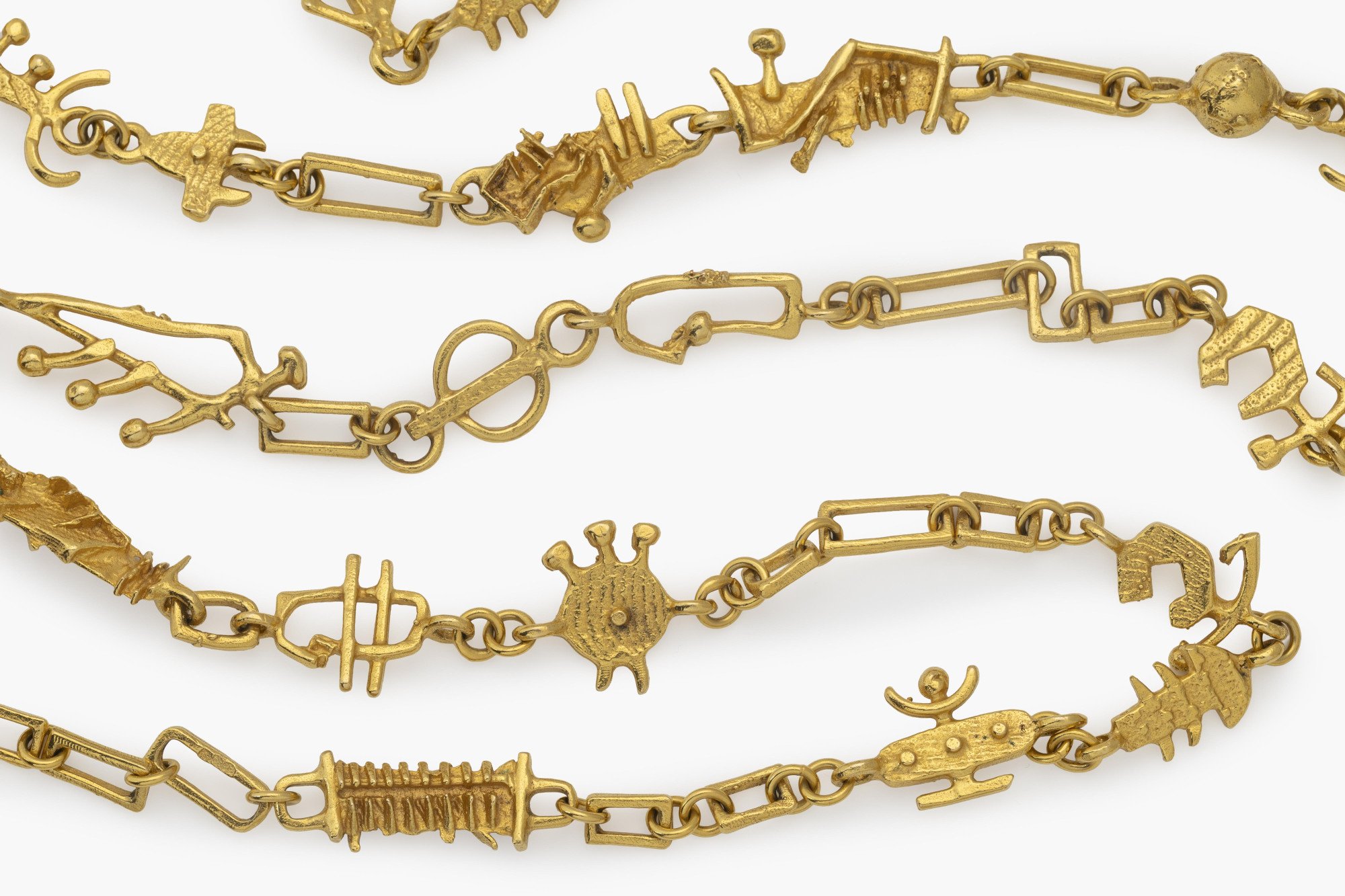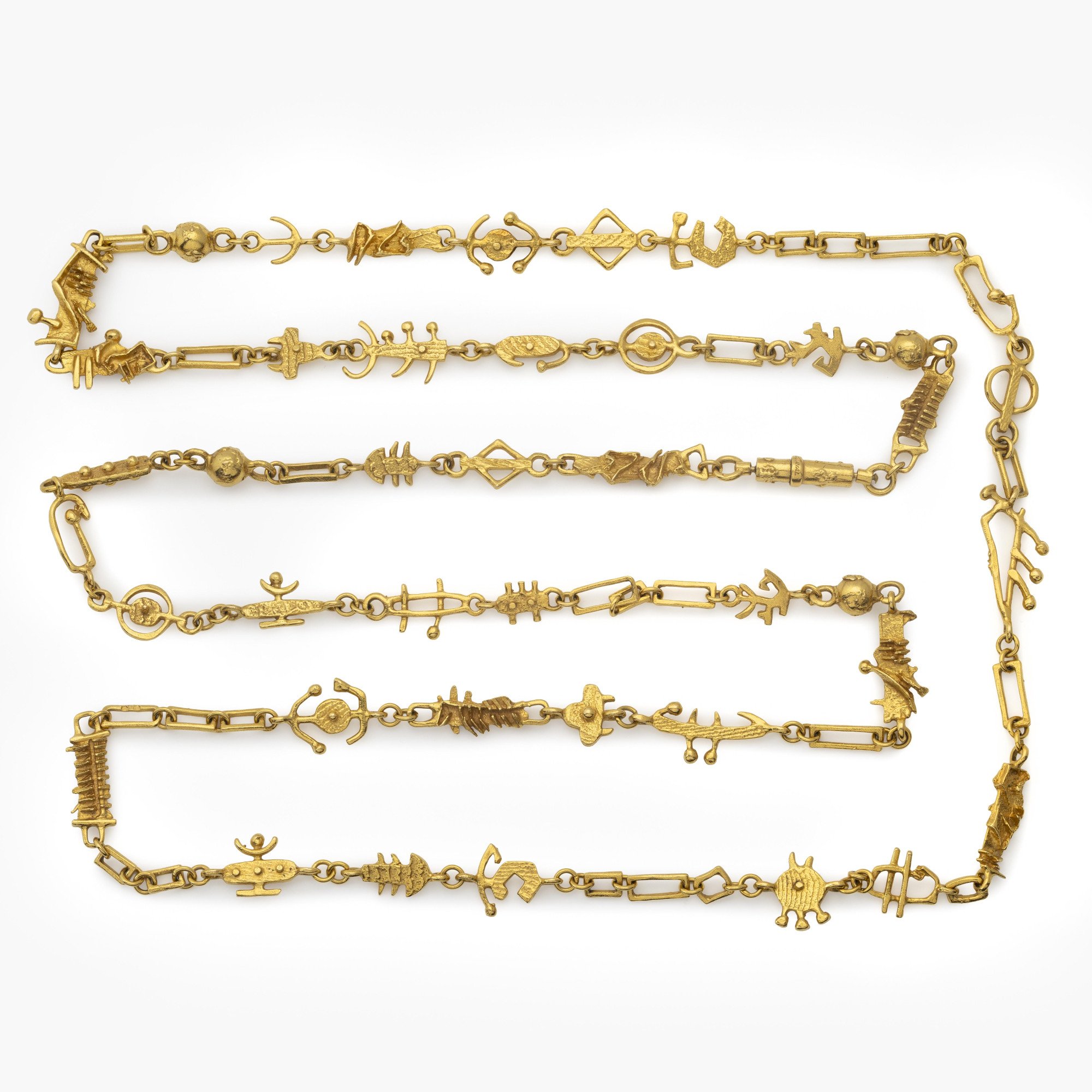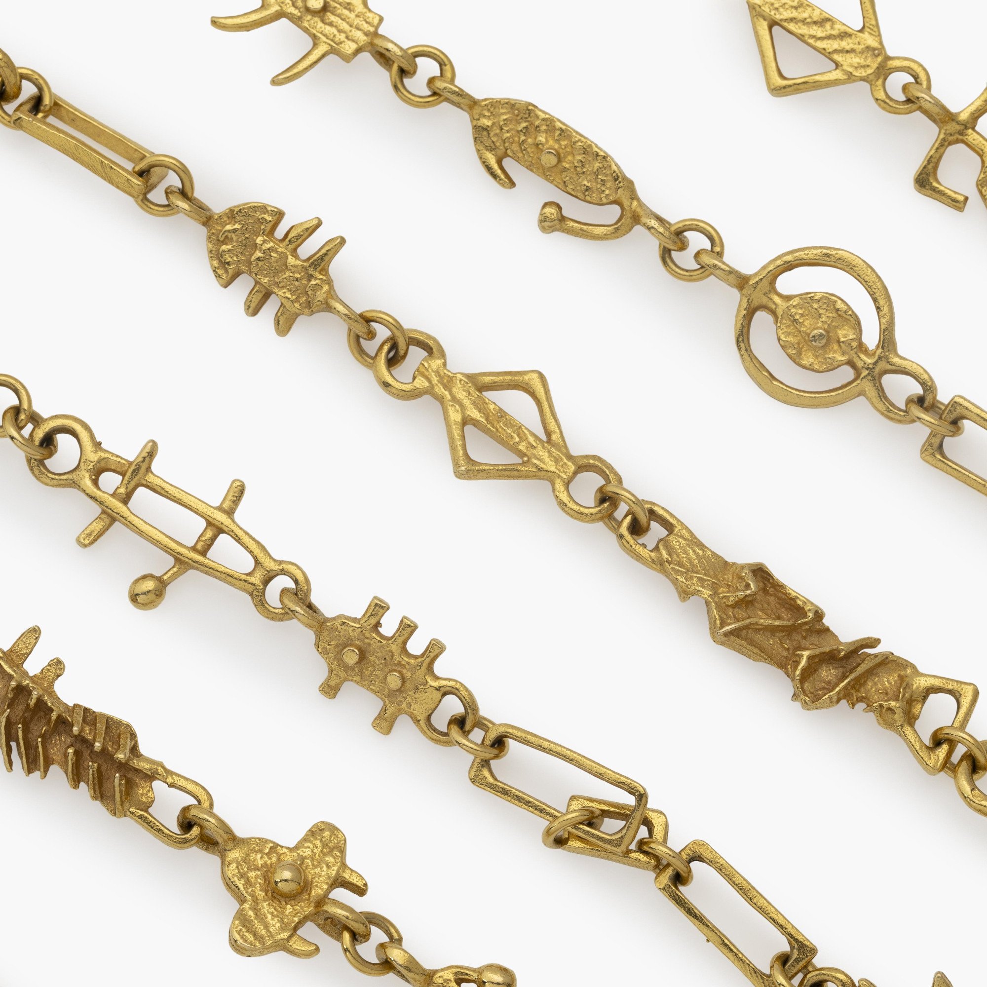 An eighteen-carat yellow gold longchain composed of linked abstract motifs, connected by round and rectangular links, with a swivel screw clasp, all featuring an organic texture. Signed A. Pomodoro, Artcurial edition, made in France. Numbered 2/30. Designed circa 1981.