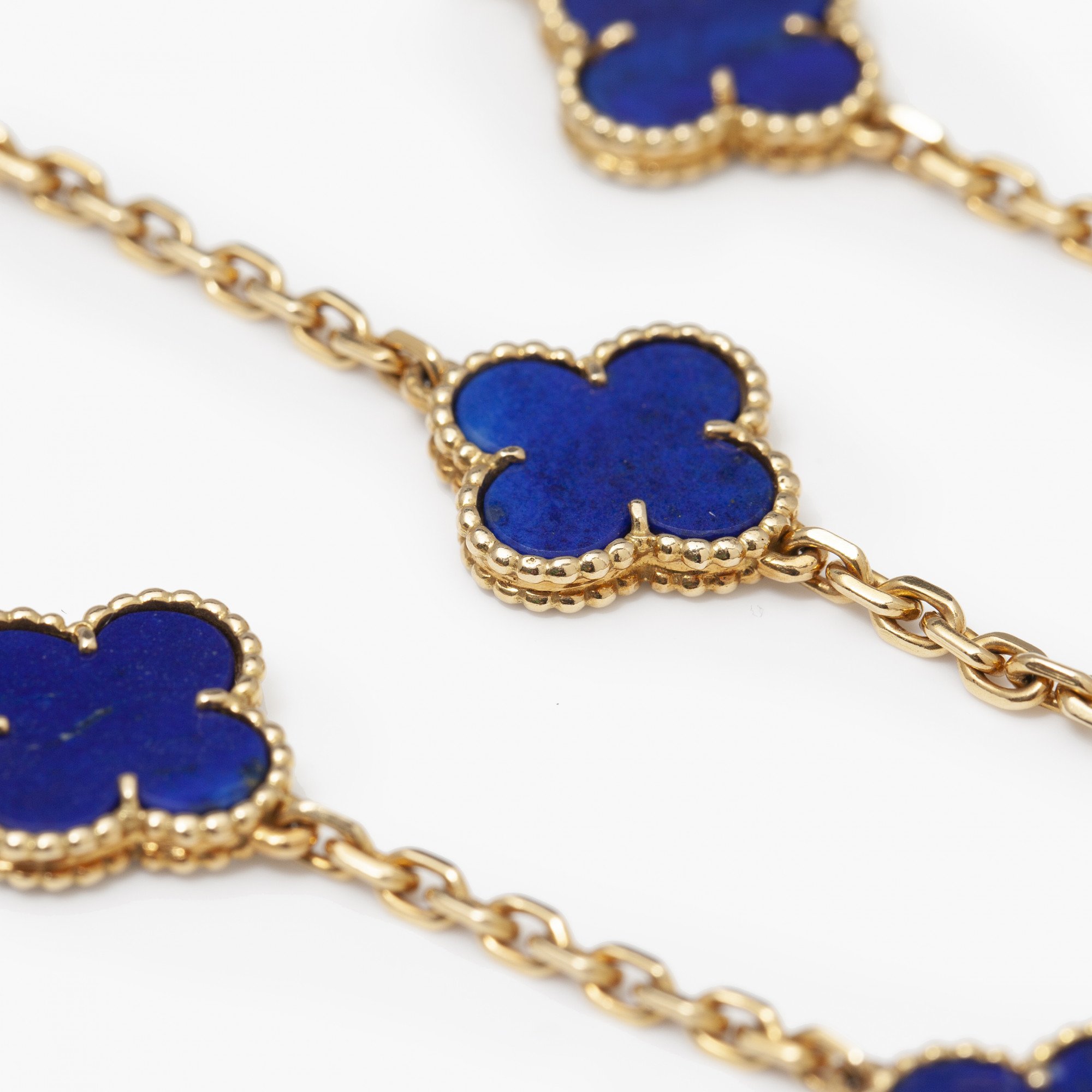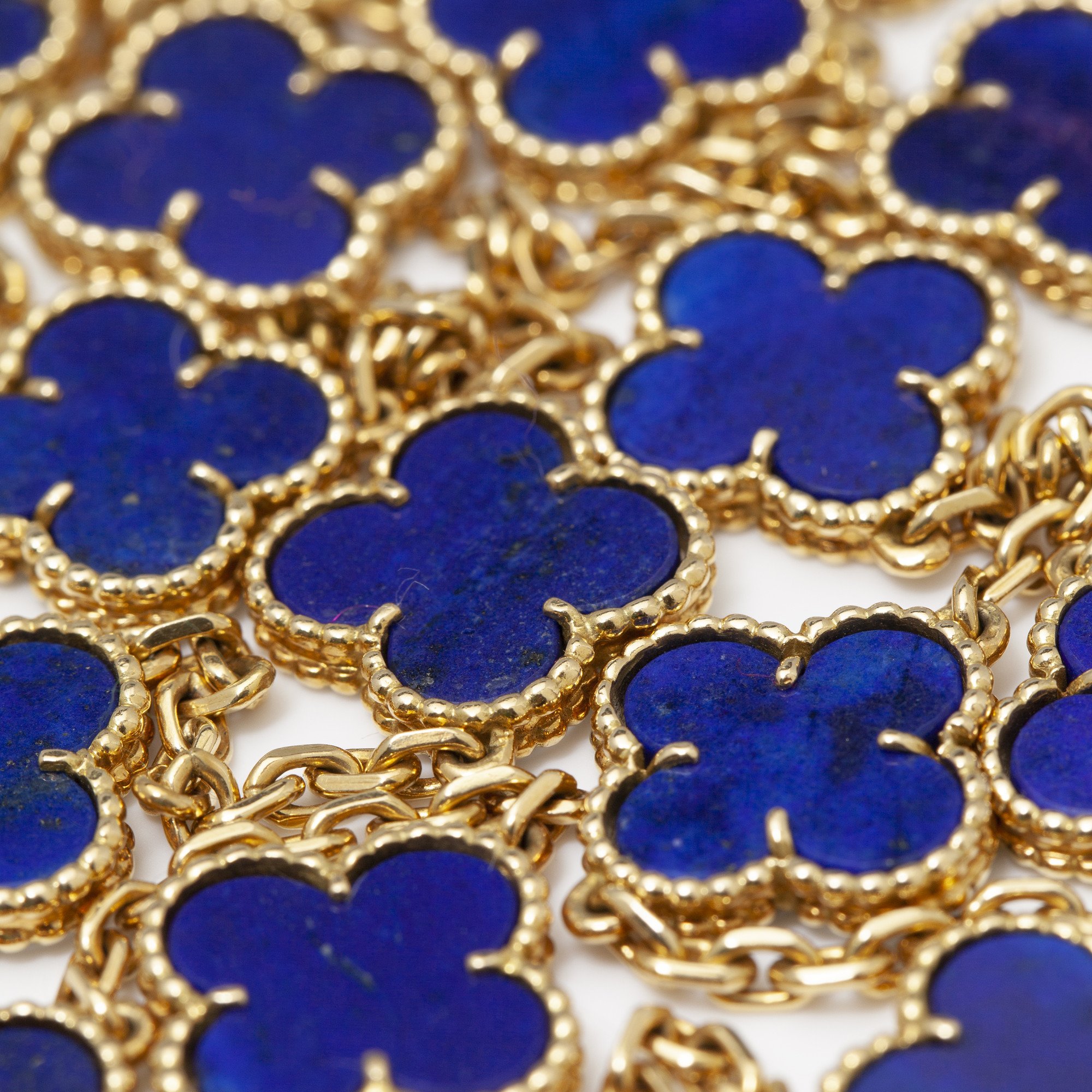 An eighteen carat yellow gold “Alhambra” longchain made of diamond cut cable chain, with on similar distances a total of twenty “Alhambra” motifs carved out of lapis lazuli in granulé frame, to a spring clasp. Signed Van Cleef & Arpels and numbered. Made in Paris, ca 1970.